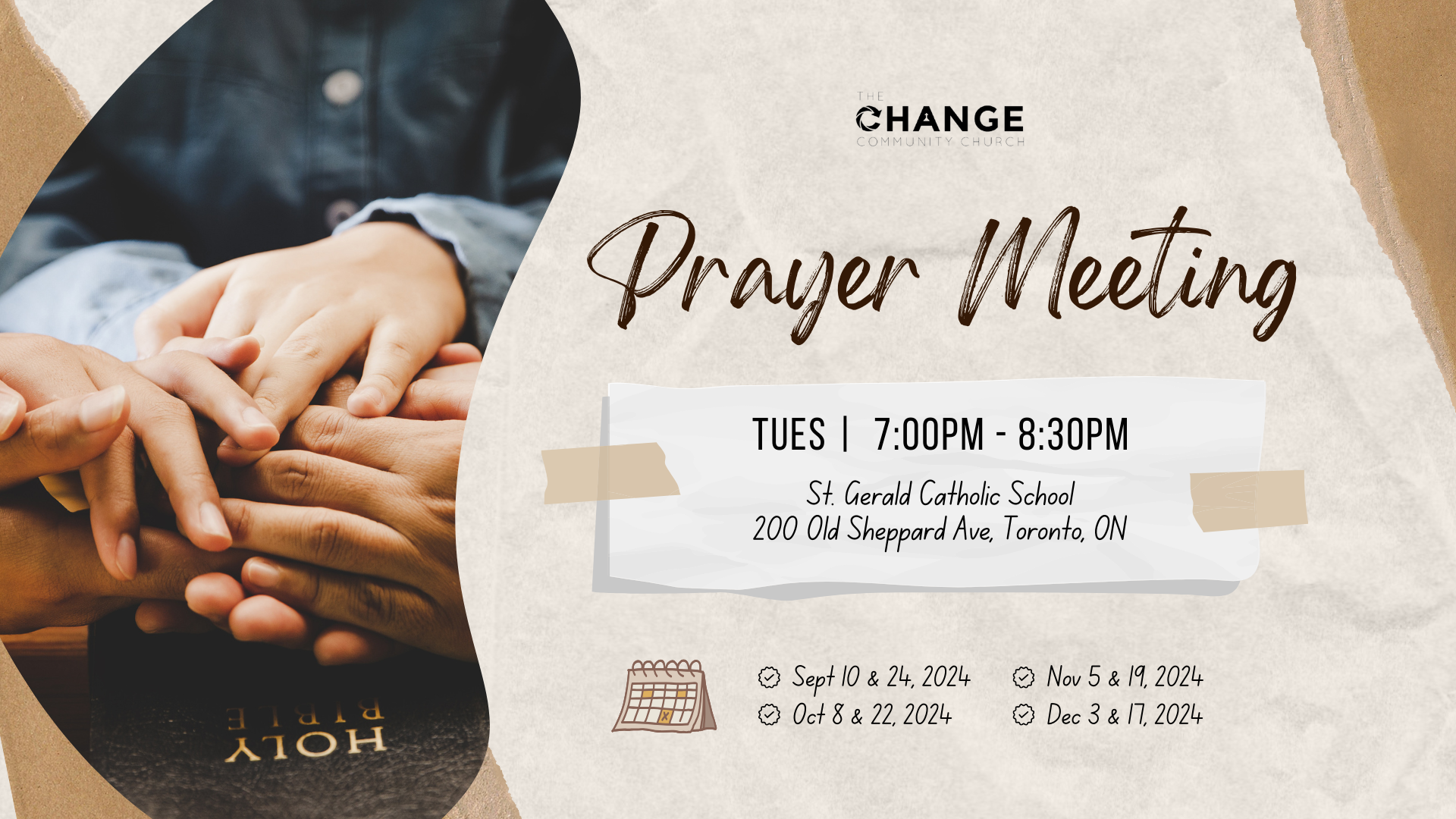 Bi-weekly prayer meetings on Tuesdays, from 7pm to 8:30pm.